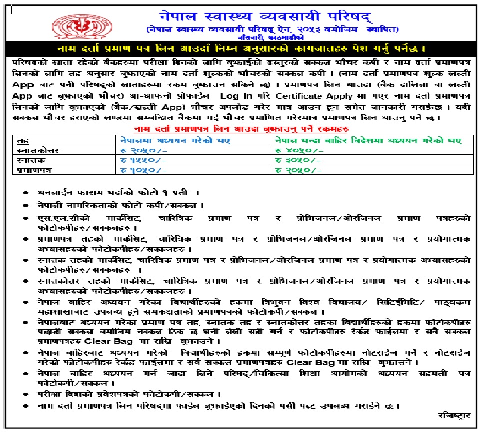 मिति २०७७/११/२२ गते को परिषद् को निर्णय अनुसार प्रमाण पत्र जारी भएका स्वास्थ्य ब्यवसायीहरु को नामावल